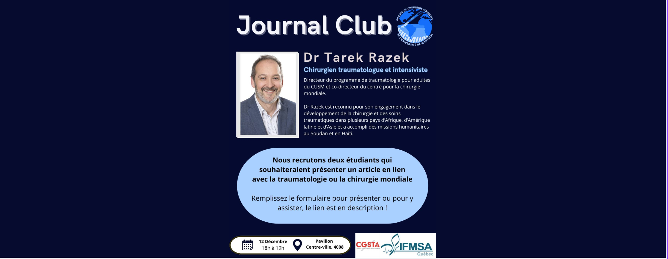 Description de l’événement : Le GICMUM a le plaisir de vous inviter à son premier Journal Club de l’année qui se tiendra le 12 décembre à 18h au Pavillon Centre-ville ! Nous avons l’honneur de recevoir Dr Tarek Razek, chirurgien traumatologue et intensiviste, directeur du programme de traumatologie pour adultes du CUSM et co-directeur du Centre pour