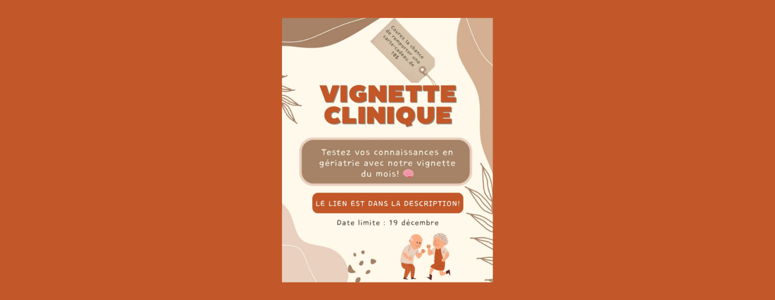Description : Le GIG a officiellement lancé ses vignettes cliniques du mois. Allez tester vos connaissance sur la gériatrie et courez la chance de gagner une carte-cadeau de 10$! Si vous êtes intéressés, veuillez consulter le lien ci-dessous pour accéder à la vignette et obtenir plus d’informations. Date limite : 19 décembre 2025 Heure :