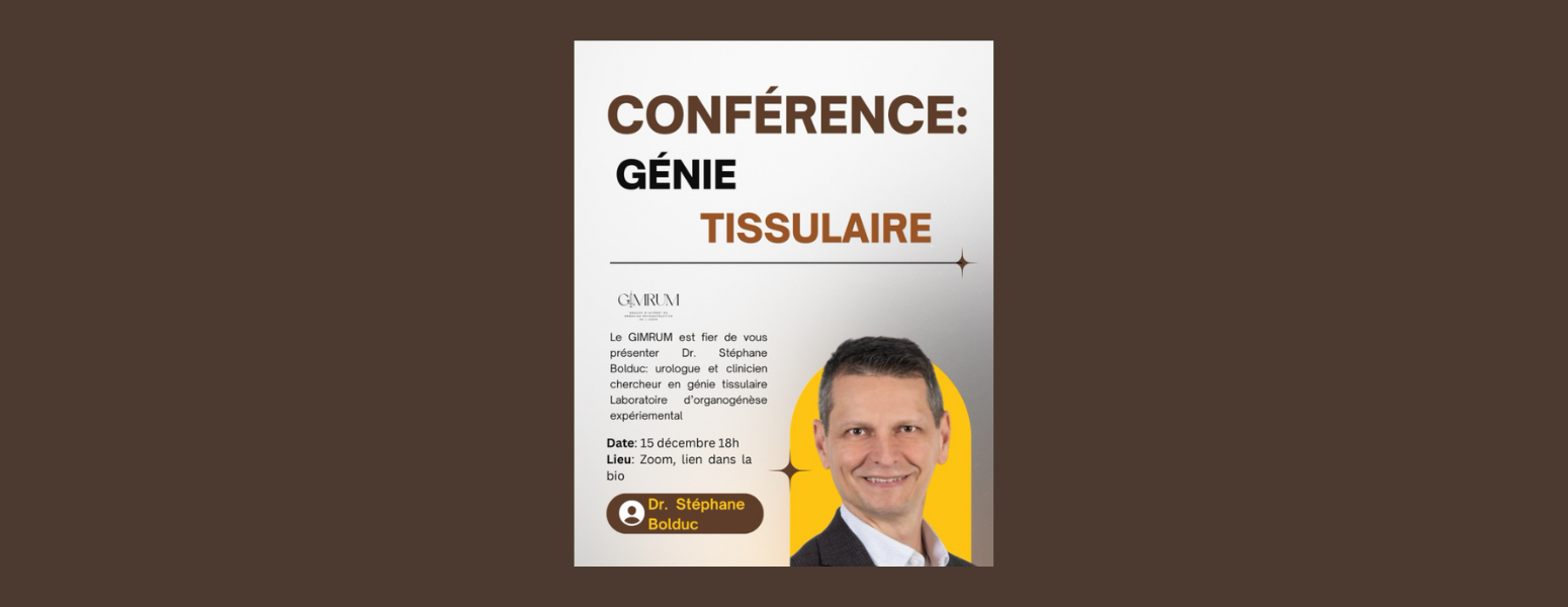 Description : Le GIMRUM organise une conférence virtuelle avec le Dr Stéphane Bolduc, urologue et clinicien-chercheur en génie tissulaire au Laboratoire d’organogénèse expérimentale (LOEX), qui abordera la génie tissulaire et le rôle de sa recherche sur la reconstruction urologique. Si vous êtes intéressés par cette conférence, veuillez consulter le lien ci-dessous pour plus d’informations. Lieu