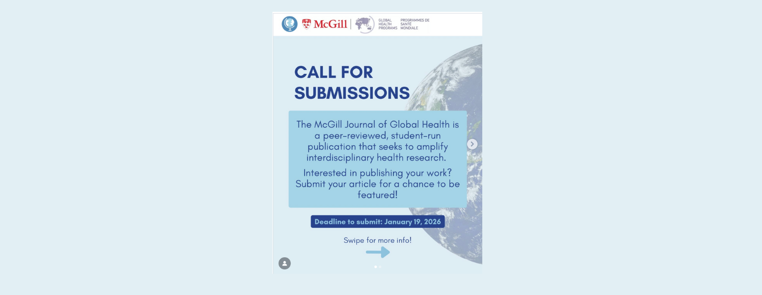 Description de l’événement : Le McGill Journal of Global Health accepte désormais les soumissions de projets de recherche, de commentaires ou de toute autre forme de contenu en lien avec la santé globale et l’équité en santé pour sa prochaine édition ! Date limite : 19 janvier 2026. Suivez le lien ci-dessous pour en savoir
